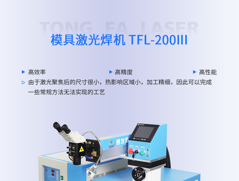 通發激光國內率先推廣國產模具激光焊機,TFL-200Ⅲ升級型世界500強選用,針對精密塑膠模具激光焊、鏡面塑膠模具激光燒焊、精密壓鑄模具激光焊補.為國內模具修復行業做出巨大貢獻。